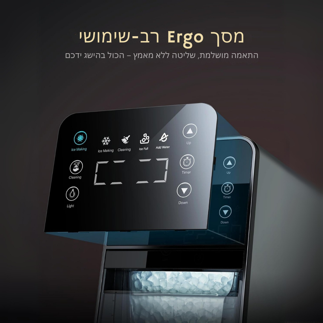 ™Soren מייצר קרח נאגט רך ונעים ללעיסה – אידיאלי לקוקטיילים, קפה קר ומשקאות מרעננים. מתאים לשיש בבית, עם קיבולת אחסון של 3 ליברות, כך שתמיד יהיה לכם קרח מוכן לאירוח או לפינוק יומיומי.